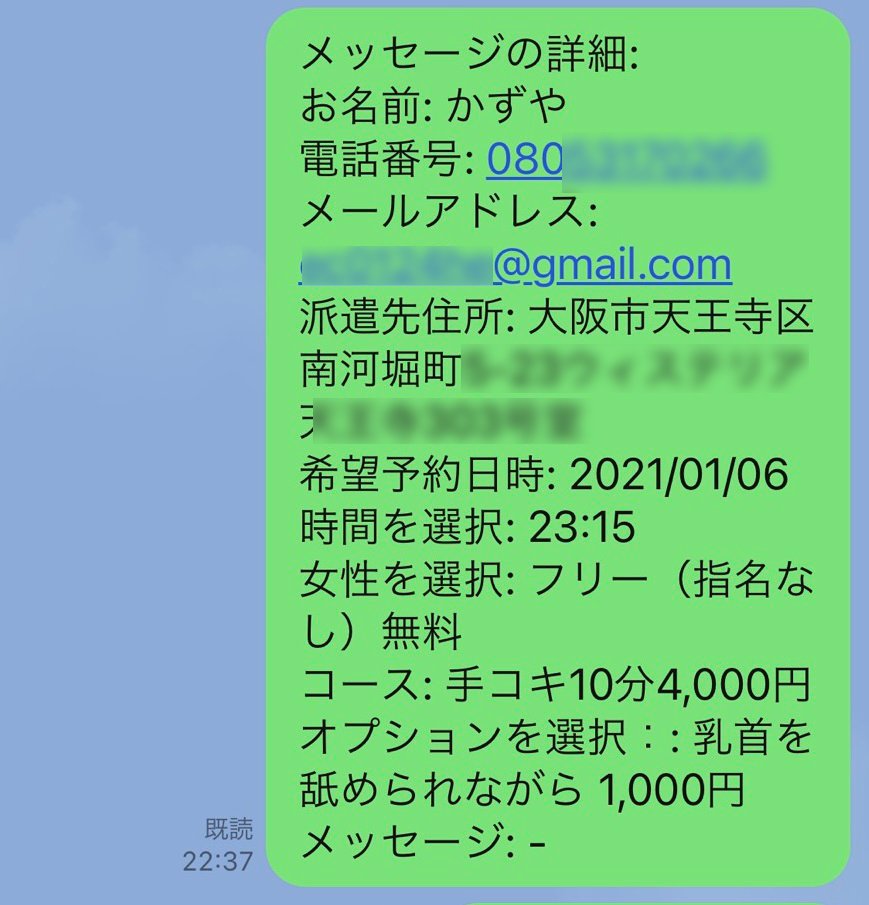 到着したらLINEにてお伝えください。自宅(一戸建て・マンション・アパート・長屋・文化住宅)、会社事務所、ホテルなど事前に確認しますが、もし特定できない場合は連絡してください。入室する時にLINEにてお伝えください。